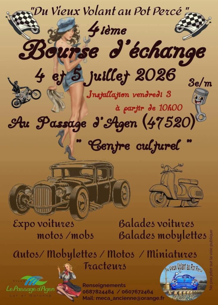• 10 et 11 Janvier 2026 : 35e Bourse d’échanges à Tonneins (47) du 10/01/2026 au 11/01/2026. Les Calandres Tonneinquaises, rue du Pont aux Abattoirs, 47400 Tonneins Tél : 06 71 71 10 47