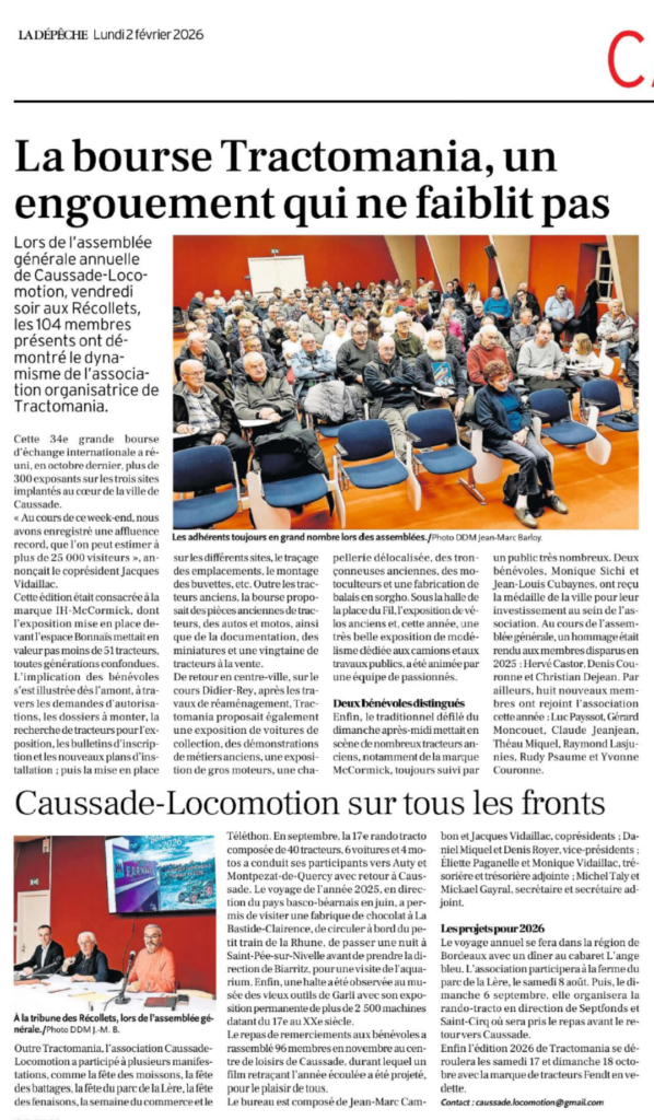 Articles : https://www.ladepeche.fr/2025/09/08/la-rando-tracto-de-caussade-locomotion-12916860.php https://www.ladepeche.fr/2025/07/07/caussade-locomotion-prepare-deja-tractomania-12810194.php https://www.ladepeche.fr/2025/06/26/voyage-et-escapade-en-terre-bearno-basquaise-avec-tracto-12787219.php https://www.ladepeche.fr/2025/04/11/tractomania-une-presidence-a-deux-tetes-12629777.php Après 12 ans , Yves Durand passe la main à Caussade-Locomotion